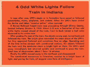 After passing the rear of the train, the objects swung east, turned back and followed the train. The bright glow concealed the exact shape of the UFO's, but they appeared flattened and sometimes flew on edge. Operating part of the time in-line abreast with coordinated motions, the objects followed the train until the conductor shone a bright light on them. The UFO's sped away immediately but returned quickly and continued to pace the train. Total time of observation: about 1 hour 10 minutes.
