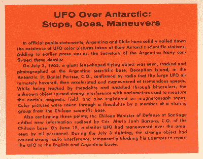 On July 3, 1965, a giant lens-shaped flying object was seen, tracked and photographed at the Argentina scientific base, Deception Island, in the Antarctic. Lt. Daniel Perisse, C.O., confirmed by radio that the large UFO alternately hovered, then accelerated and maneuvered at tremendous speeds. While being tracked by theodolite and watched through binoculars, the unknown object caused strong interference with variometers used to measure the earth's magnetic field, and also registered on magnetograph tapes. Color pictures were taken through a theodolite by a member of a visiting group from the Chilean scientific base.