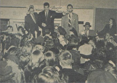Concert tour in 1951 shattered more records; Cincinnati's Music Hall had hundreds of standees; near-riot in a Scranton store (left) amazed Mario and manager Sam Weller (with glasses), music-lover who'd had faith in an unknown. |