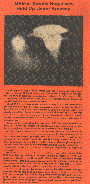 At first, fearing ridicule, the Luccis avoided publicity. After two days, friends persuaded them to show the pictures to the Beaver County Times.The newspaper's three photographers superimposed the negatives and made other tests which showed the UFO had slowly moved closer, left to right, as described. After a full evaluation, they labeled the photos genuine. This was later confirmed by NICAP Photographic Adviser Ralph Rankow.
